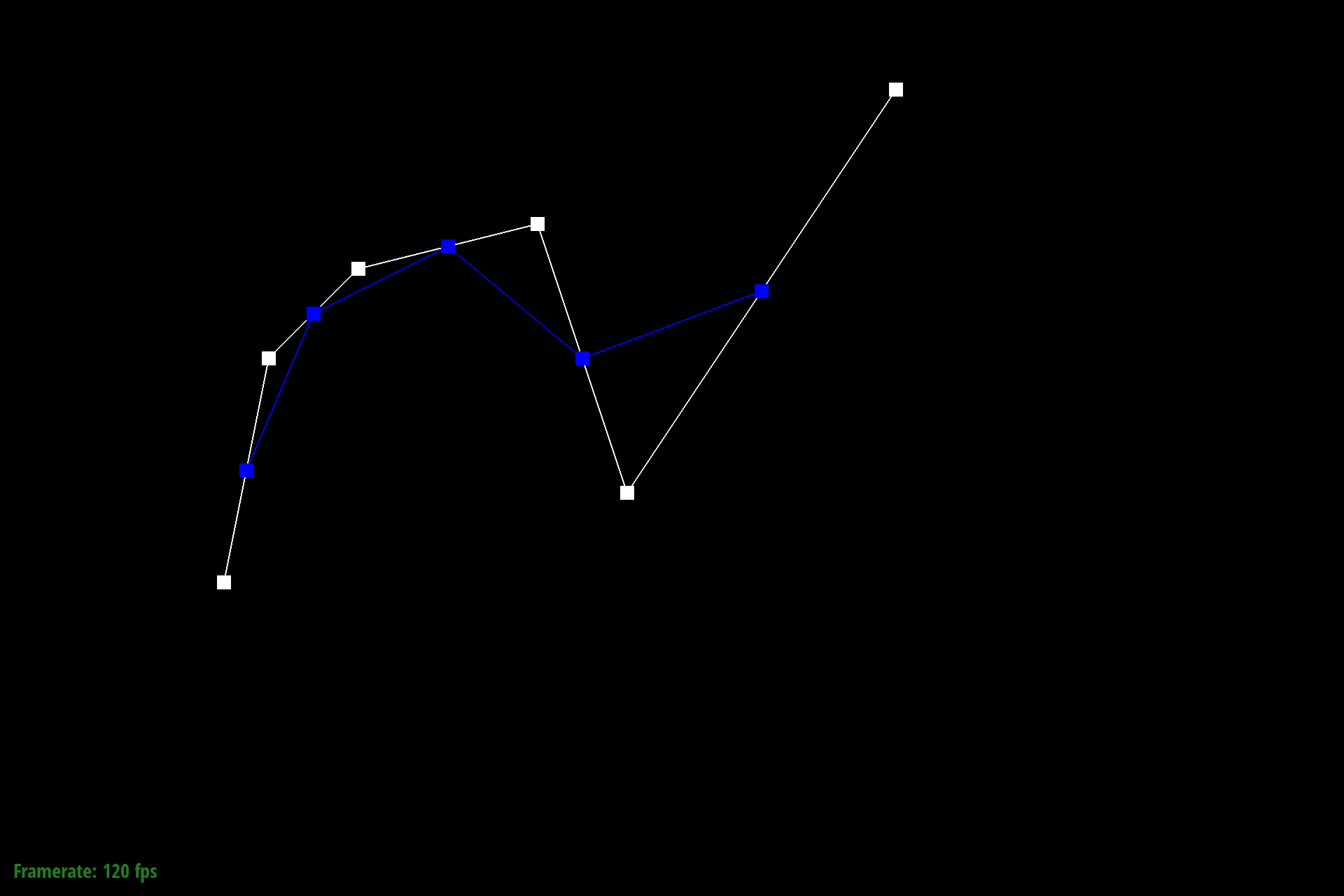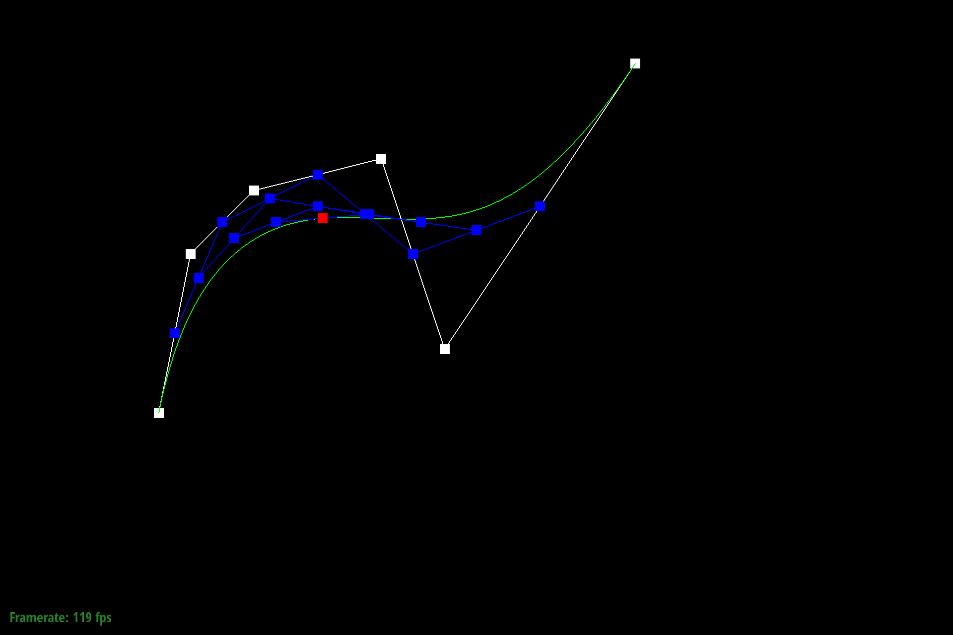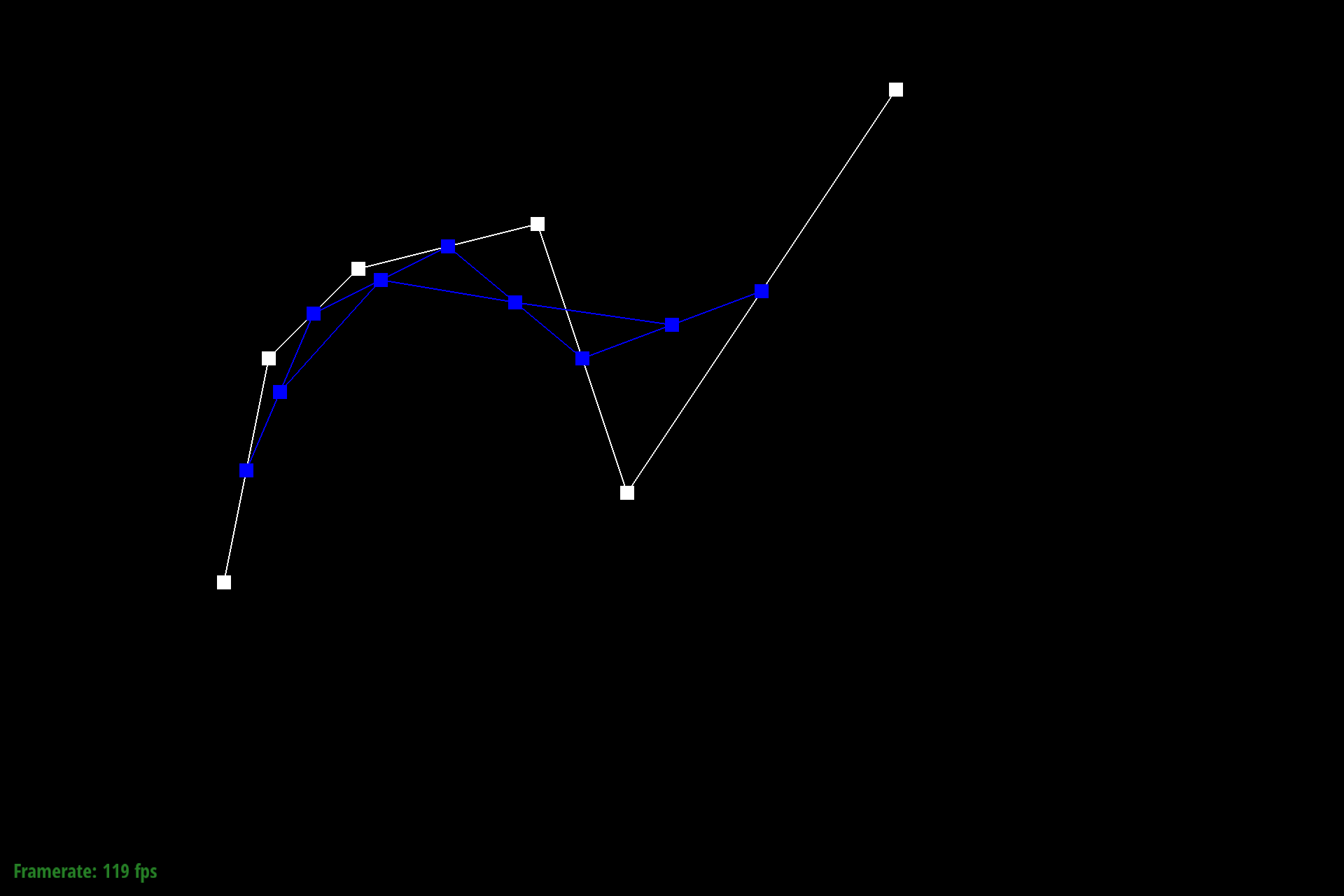 $$q_i = lerp(p_i, p_{i+1}, t) = (1-t) p_i + t p_{i+1}$$To store the result of this calculation we push results into a C++ stdlib vector of Vector2D objects. The last point at index $n-1$ ($n$ being the size of the input points vector) is excluded since de Casteljau requires a subsequent control point.