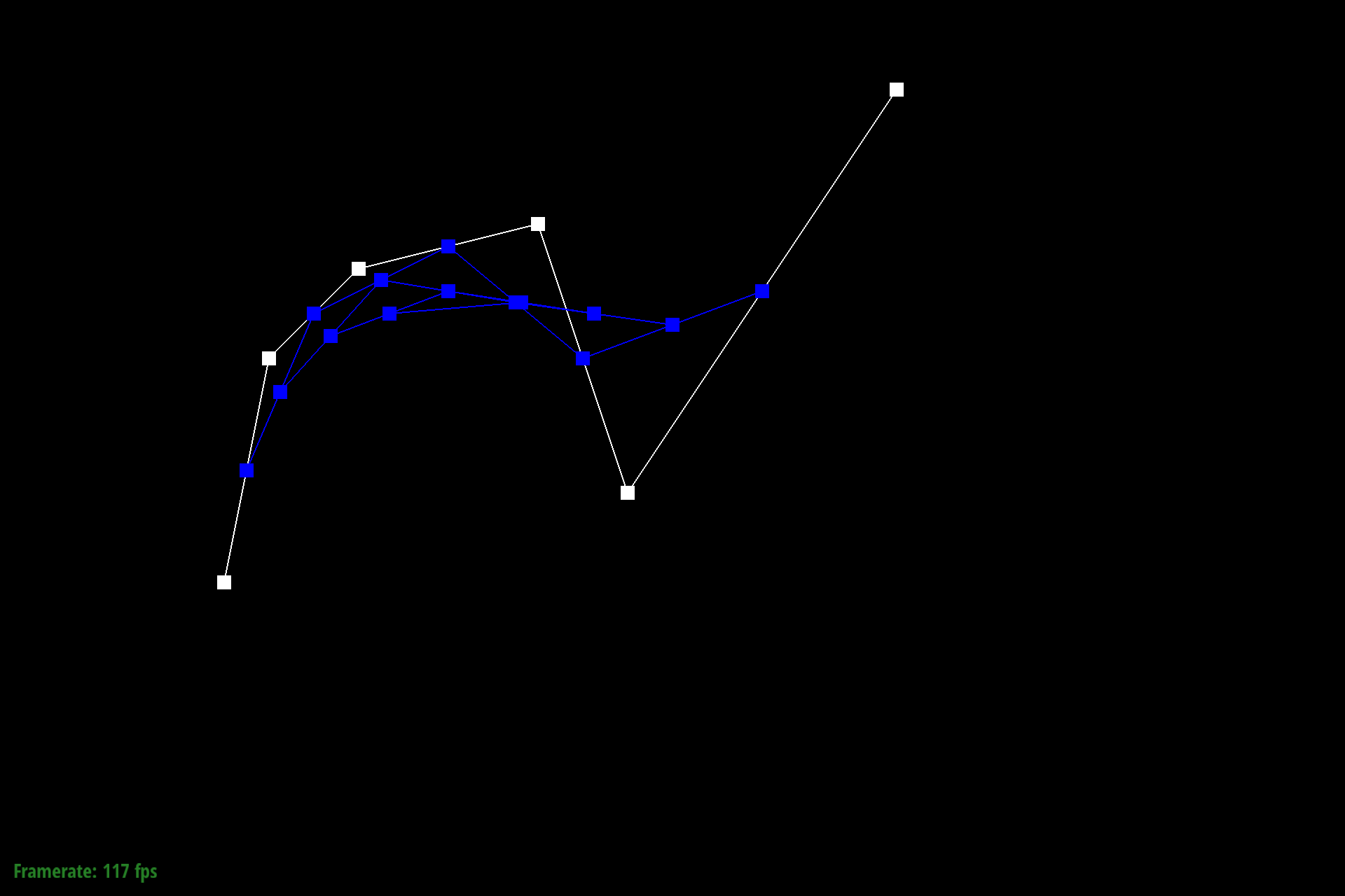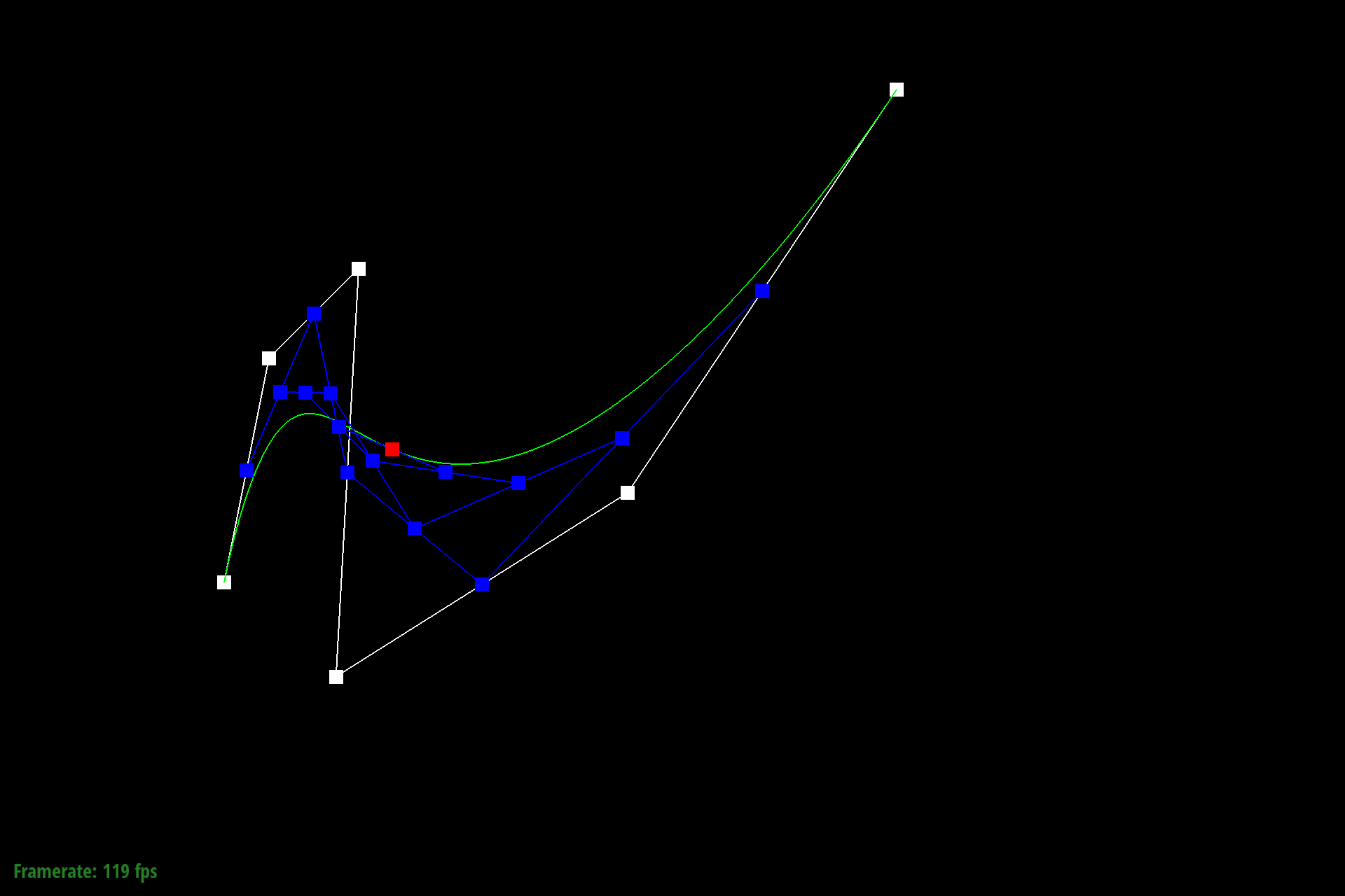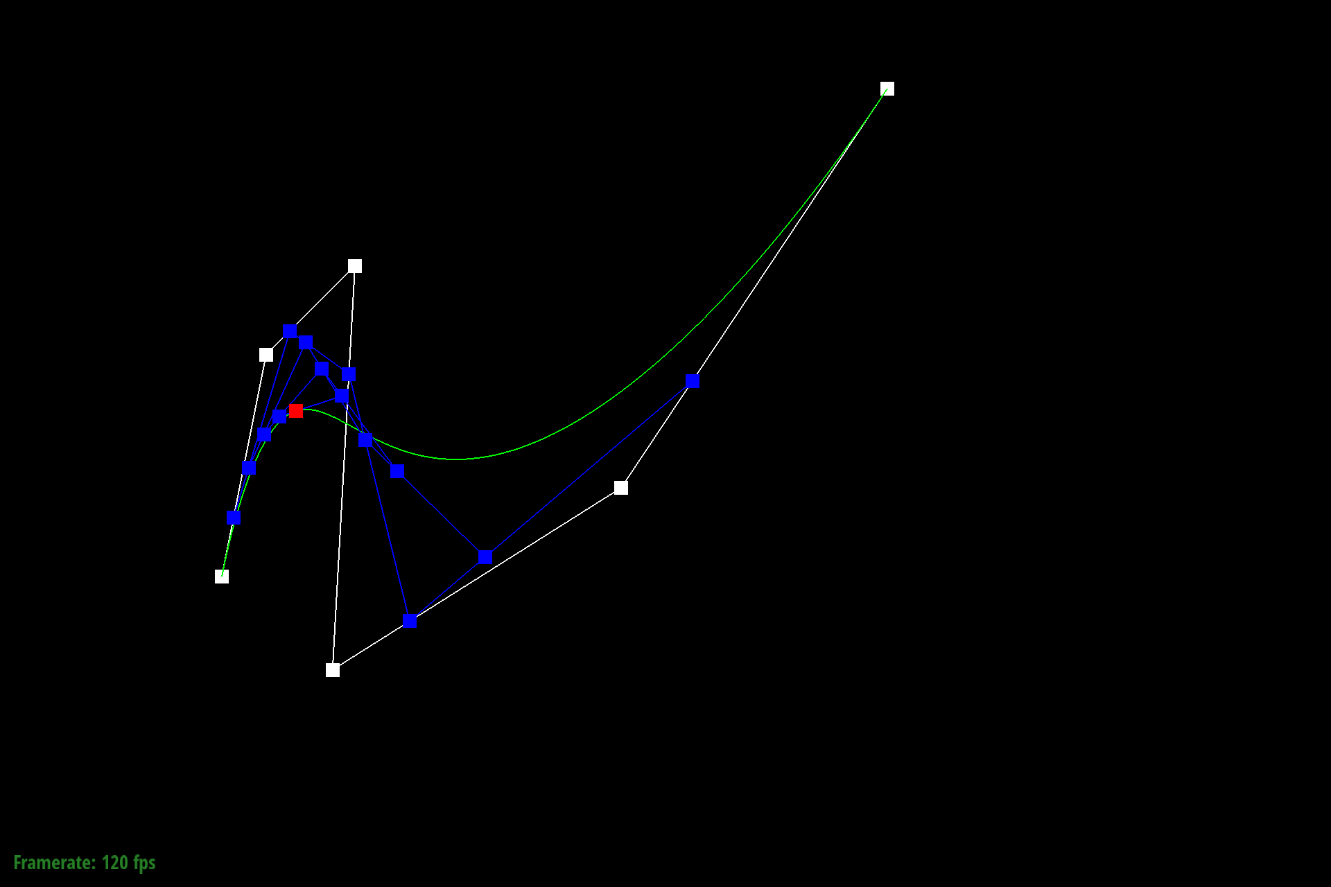 $$q_i = lerp(p_i, p_{i+1}, t) = (1-t) p_i + t p_{i+1}$$To store the result of this calculation we push results into a C++ stdlib vector of Vector2D objects. The last point at index $n-1$ ($n$ being the size of the input points vector) is excluded since de Casteljau requires a subsequent control point.