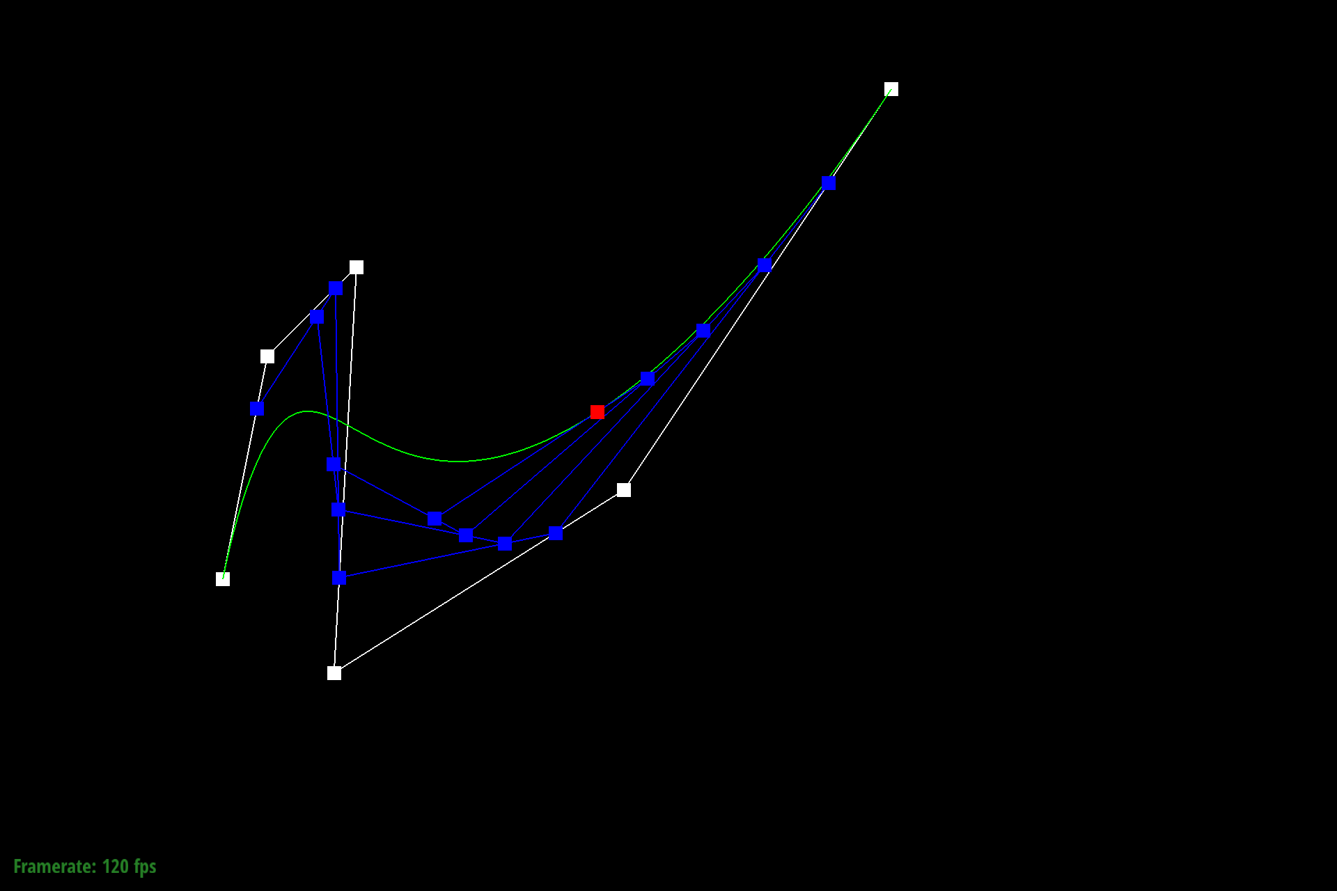 Given a set of $n$ control points and timestep $0 \leq t \geq$, de Casteljau's algorithm finds $n-1$ intermediate points between each consecutive pair. When this step is applied recursively until one point remains, we eventually find the single point on the bezier curve at $t$.