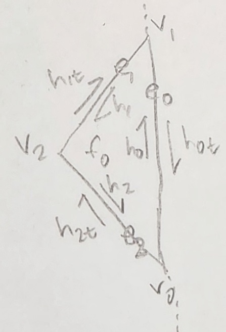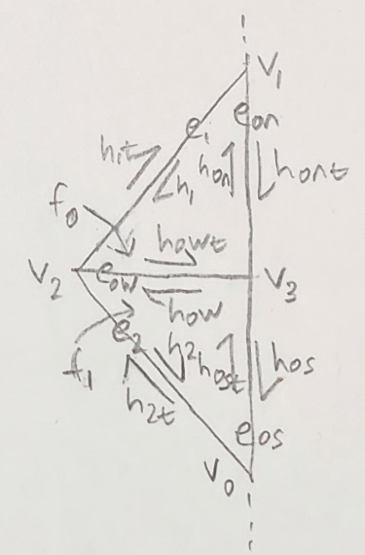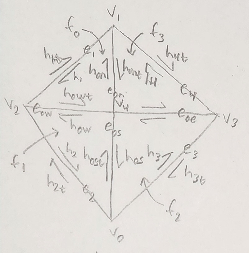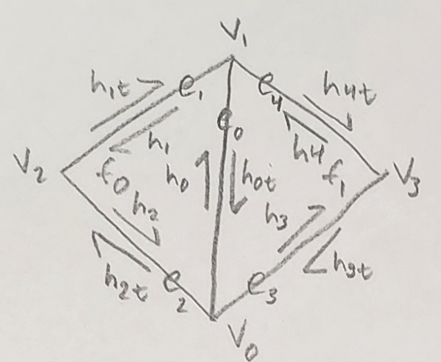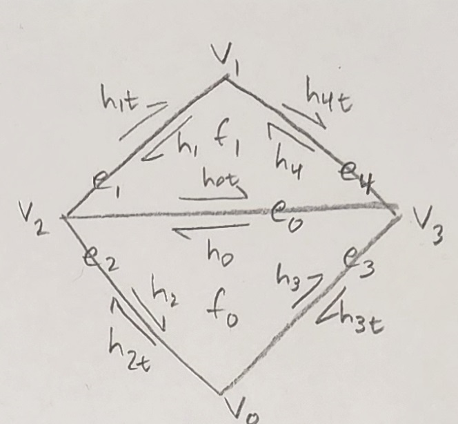 A hand drawing of this is included below. Note that we choose to use the convention of having twin edges labeled as $h_{Xt}$. So for example the halfedge $h_0$ has a twin $h_{0t}$. The t stands for "twin" and is a way to denote inner and outer edges. The inner edges are $h_X$ while the outer are $h_{Xt}$. Also, see that the halfedge corresponding to the original edge is $h_0$, and each next halfedge increments this number. When we reach the end of the first triangle, ordering is applied to keep the edge count increasing on the outside of the mesh i.e. $e_0$ then $e_1$ then $e_2$ etc.