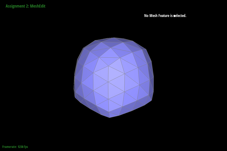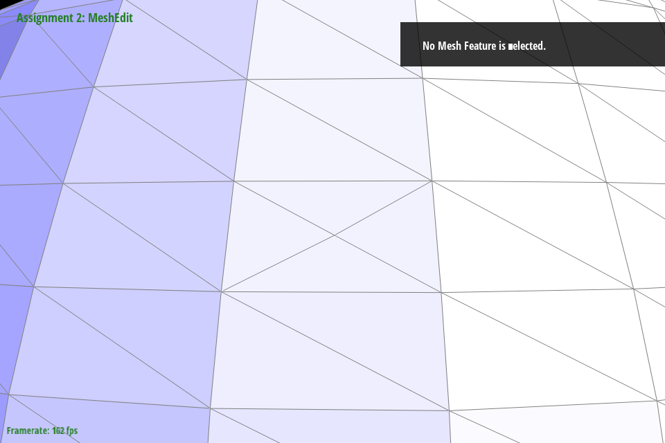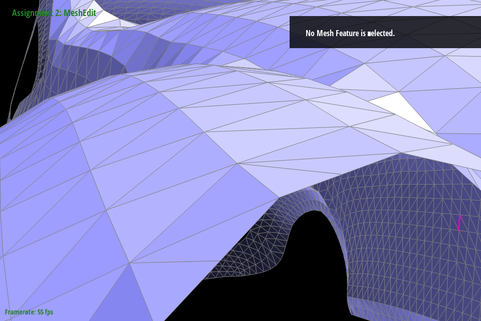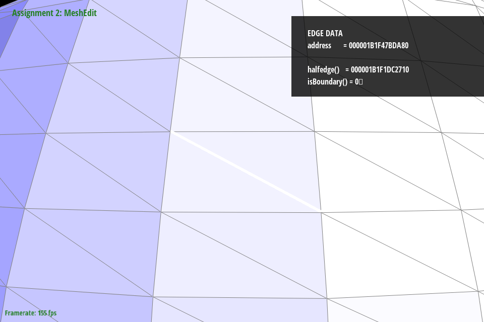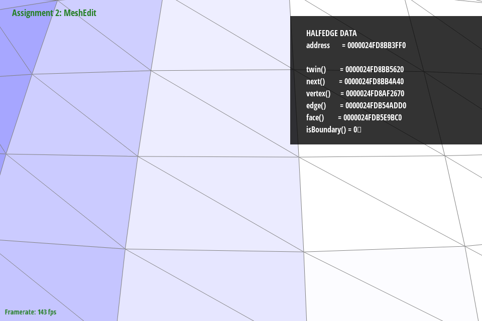 In debugging, we primarily relied on viewing the mesh in the GUI and selecting different components. By noting the address and comparing it to other objects, we could see where pointers were being assigned and if they were being assigned correctly. As a trick to make debugging faster, we truncated addresses to the last 4 digits since most components around a mesh seemed to be unique in that address space. Originally we tried with 3, but that led to some components being mistaken for each other that were in fact distinct in the fourth digit. We also ended up using temporary variables to store all halfedges, twinned halfedges, faces, edges, and vertices following my naming format outlined above. This saved debugging time by making it significantly easier to spot neighbor assignment issues just from looking at variable names.
