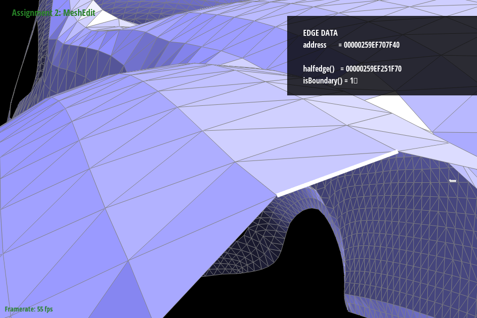 “By noting the address and comparing it to other objects, we could see where pointers were being assigned and if they were being assigned correctly. As a trick to make debugging faster, we truncated addresses to the last 4 digits since most components around a mesh seemed to be unique in that address space. Originally we tried with 3, but that led to some components being mistaken for each other that were in fact distinct in the fourth digit. We also ended up using temporary variables to store all halfedges, twinned halfedges, faces, edges, and vertices following my naming format outlined above. This saved debugging time by making it significantly easier to spot neighbor assignment issues just from looking at variable names.”
