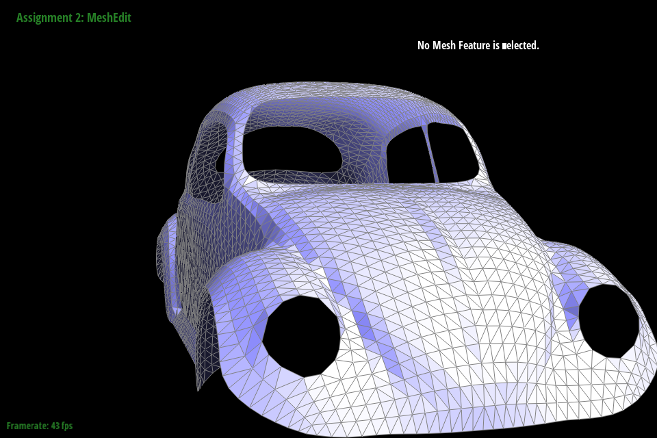 In this assignment, we implemented rendering of Bezier curves and surfaces in addition to rendering of triangles meshes. Bezier curves (and subsequently surfaces) are built using the de Casteljau algorithm and Phong shading was applied to render Bezier surfaces. Unlike the previous rasterizer assignment, this assignment requires the use of half-edge data structures which define triangle meshes. We implement flipping and splitting on edges in halfedge-defined meshes, then use these features to upscale the meshes using loop subdivision. As extra credit we also designed our own model in Blender and supported loop subdivision for boundary edges. An additional feature we implemented was a screenshot hotkey (as in homework 1) with minimal text blurring and a black background (instead of transparency).